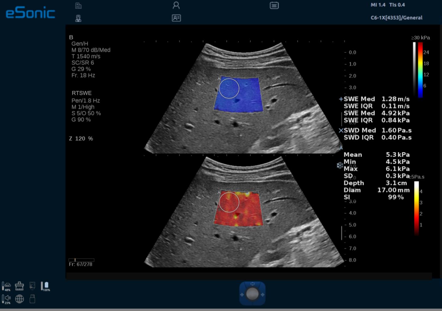 ePascal东风80通过专利的纯软件波束成形和扫描转换技术,消除了传统的硬件负担。无论是宽带宽能力、超高速采集(帧频可达到25000帧/秒)和数据传输速度(可达到10GB/秒),还是高端图形图像处理器(GPU大算力)的首次应用,都为医生们提供了前所未有的诊断信心。这些技术共同作用下,使得图像对比度分辨率显著提升,细节展现得淋漓尽致。其中ePascal东风80融合了RTSWE®实时E成像、QSOS®声速定量成像、ATITM高级声衰减成像、超微血流成像,平面波全息多普勒以及智能穿刺引导等超声领域多项前沿创新技术。